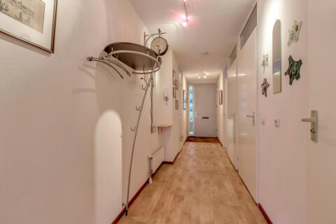 Vanuit de hal krijgen we toegang tot de meterkast, aansluitend bevind zich de 2e slaapkamer, daarnaast de inpandige berging met opstelling cv ketel, warmte-terug-winning-unit (wtw), voorraadruimte en aansluitingen voor wasmachine en droger, separaat toilet met vrijhangend closet en fonteintje, badkamer met ligbad, separate douche, vaste wastafel met spiegel (met verwarming) en designradiator, lichte woonkamer over de gehele breedte met grote schuifpui en loopdeur naar het terras (met waterkraan), open keuken met L- vormig keukenblok uitgevoerd met inbouwapparatuur waaronder grote koelkast, aparte vriezer, combi magnetron (nieuw), vaatwasser, recirculatie afzuigkap en 4 pits gasfornuis.
