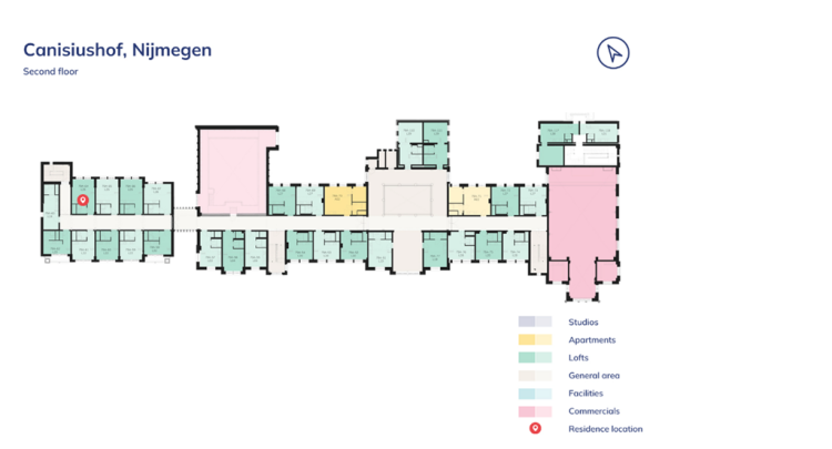 This loft is one of the 120 unique homes for rent at Canisiushof. Coming in through the monumental hallways, you’ll find this loft on the second floor. Highlights of this home are the high ceiling and extra loft area, looking out over the living room. Speaking about living in a characteristic place!