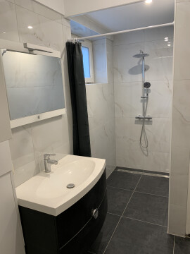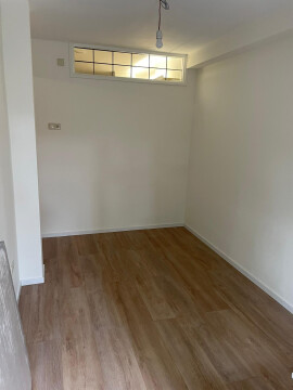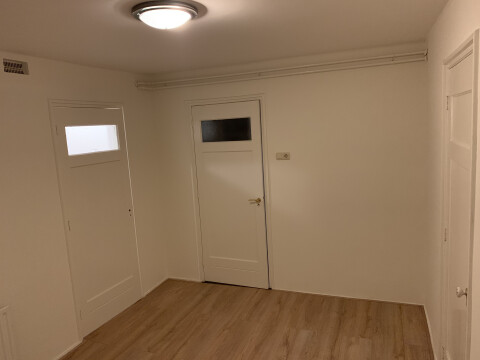 Het appartement heeft een eigen ingang met direct een ruime hal. De wc bevindt zich in de gang net als de opbergkast.(Staat niet op foto) Aan de rechterkant bevindt zich de grote slaapkamer en de ingang naar de badkamer. De badkamer bestaat uit een inloop regendouche en een wastafel. Verder is er ruimte voor een wasmachine en eventueel een droger.