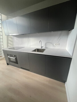 The open kitchen works great for cooking up your favorite meal while staying in contact with guests in your living room. This modern and dark kitchen has a white counter to top it off. Appliances include an induction plate, fridge with small freezer compartment, dishwasher, and cooker hood.