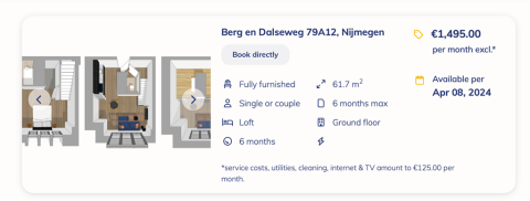 no. 52 € 995 + €185 utilities and WIFI per 19 september 2024